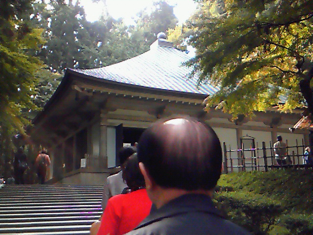 金色堂に向かう階段とどこかのおじさんの頭